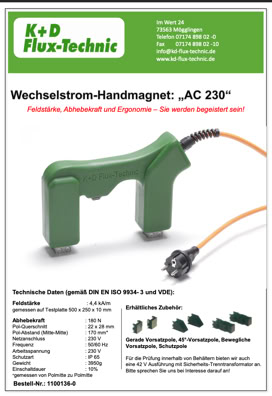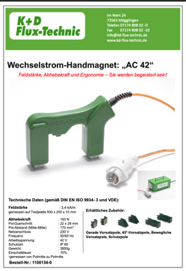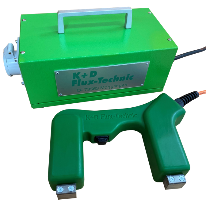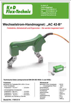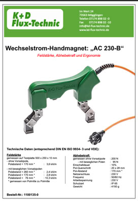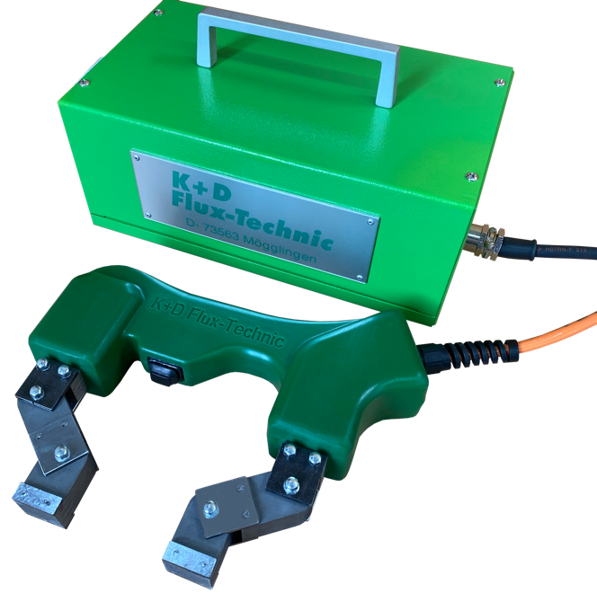 Feldstärke: 2,4kA/m bis 10,3 kA/m je nach gewählten Vorsatzpolen. gemessen auf Testplatte 500 x 250 x 10 mm
